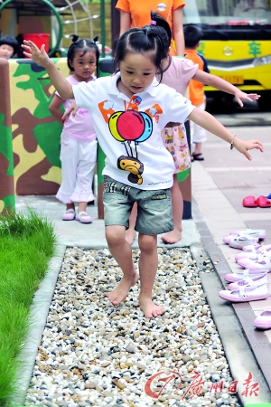 本報訊 (記者陳昕宇)赤足踩碎石、晨練時需要過“梅花樁”、俯身貼地穿越水管、輕舒猿臂通過懸掛在半空中的吊臂、寒冬冷水浴……上述情景不是出現(xiàn)在特種部隊的訓(xùn)練營中,而是佛山一所位于高檔住宅小區(qū)的幼兒園專為幼兒所開設(shè)的生存磨難教育課程。 據(jù)介紹,生存磨難課程最早起源于日本教育界,目的為磨煉學(xué)生的意志。昨日,記者來到該所幼兒園,對生存磨難教育的部分項目進(jìn)行了體驗。