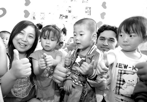 家住張家口橋東區(qū)的李曉霞從北京第二外國語學(xué)院畢業(yè)后,回鄉(xiāng)創(chuàng)業(yè)創(chuàng)建了“新東方幼兒園”,她既要面對家庭的重負(fù)和經(jīng)濟(jì)上的壓力,又要不斷提高創(chuàng)業(yè)的素質(zhì)和能力。在橋東區(qū)政府和婦聯(lián)的幫助下,如今她已成為擁有90多名兒童和十幾位教師的、在當(dāng)?shù)仡H具特色的雙語幼兒園的成功創(chuàng)業(yè)者。這是李曉霞(左一)和來自巴基斯坦的外教在教孩子們學(xué)唱英文歌。