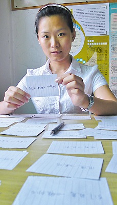 北方人難聽懂南方話,更難學(xué)重慶的地方土話!在萬州區(qū)龍沙鎮(zhèn)龍安村任村委黨支部書記助理的遼寧籍大學(xué)畢業(yè)生李飛就是其中一個,她是去年考上我市的“村官”。在9個月的“村官”生活中,她因不懂當(dāng)?shù)赝猎掫[過笑話,遭過白眼。因此,她不停地觀看帶有重慶方言和土話的電視劇進(jìn)行模仿,寫了230頁土話“名片”隨身帶,天天念。