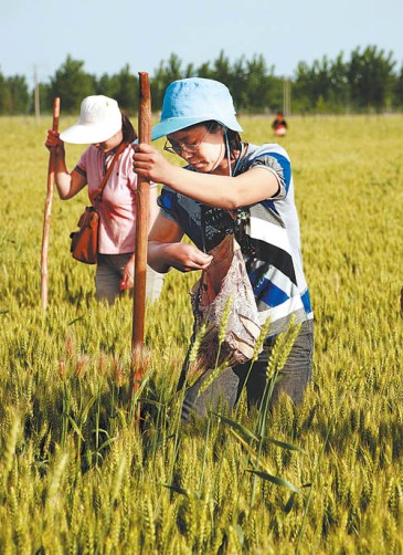 5月23日,河南省安陽市湯陰縣花耳莊村大學(xué)生“村官”張文紅(前)在即將收割的麥田幫助困難農(nóng)戶套種玉米。