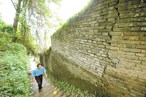 昨日下午5時左右,記者在現(xiàn)場看到,土堆有10多米高。在土堆最頂部,有一條貫通的裂縫,裂縫最寬處有8厘米左右。因受前晚昨晨的大雨沖刷,已無法確認(rèn)其是否是新發(fā)生的裂痕。土堆底部緊靠一堵圍墻,圍墻外是一條石板路,土堆最高處已堆至圍墻腰部。一部分圍墻已經(jīng)不存在——今年3月中旬的一場大雨后,土堆沉降,將這部分圍墻推倒。仍存的部分墻體,也已有松動跡象,并有裂縫朝石板路一側(cè)發(fā)生傾斜。