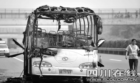 記者在現(xiàn)場看到,事故大巴車車身只剩下光架架,在彌漫著焦臭味的車廂內(nèi),遍布著被燒成灰燼的物品。相關(guān)部門工作人員忙碌著勘查現(xiàn)場。34名學(xué)生站在高速路邊,他們臉上、衣服上留著黑色灰塵。