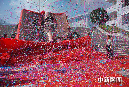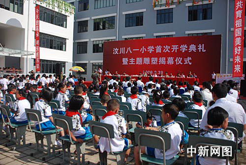 中新網(wǎng)汶川8月30日電(鐘美蘭)紅旗招展,彩帶飄飄。30日,由第二炮兵對口支援,在廢墟原址上建設(shè)汶川八一小學(xué)開學(xué),學(xué)校舉行了隆重的開學(xué)典禮。