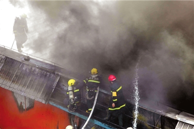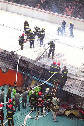 采石路消防中隊(duì)和首體南路消防中隊(duì)出動(dòng)10輛消防車相繼趕到,消防員向屋頂噴水后,攀上樓頂鑿開屋頂彩鋼板向內(nèi)噴水。很快,明火被撲滅。消防員需一人指引進(jìn)入教室,小石便自告奮勇領(lǐng)路。小石說:“教室有一個(gè)籃球場(chǎng)大,里面有音響設(shè)備和椅子等物,當(dāng)時(shí)屋內(nèi)濃煙滾滾。”他隨即撤出,消防員繼續(xù)進(jìn)行撲救。