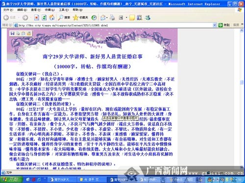 記者在QQ上與“南寧講師懸賞征婚”打招呼后,對(duì)方向記者做了說明,他是在替他同學(xué)(即“南寧講師懸賞征婚”)掛著Q。當(dāng)記者向其表明來意之后,對(duì)方告訴記者,他同學(xué)太低調(diào),太謹(jǐn)小慎微。事實(shí)上他也知道,如果廣西和南寧市的媒體一介入,其實(shí)就是一種很好的宣傳,這樣他同學(xué)能找到好姑娘的把握會(huì)更大些。