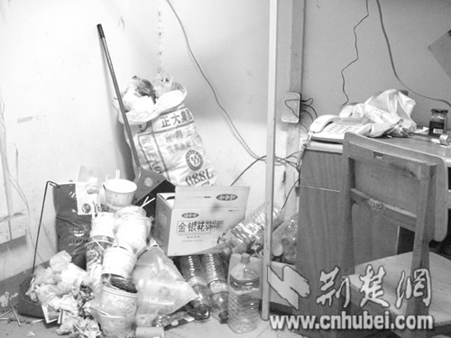 據(jù)記者了解,B棟所住的均為該校的男大學生。這行粉筆字寫在樓道的地上,記者趕到時,字跡已經(jīng)十分模糊了。在知情學生的指引下,記者進入6樓一間寢室。一進門,一陣怪味就撲面而來。四下仔細一看,寢室門后一個高近一米的垃圾堆赫然出現(xiàn)在記者眼前:用過的飯盒、塑料袋,甚至是煙頭、飲料瓶,各式垃圾堆滿一地。但在這種環(huán)境下,寢室里的4個男生卻好像絲毫沒有察覺,上網(wǎng)、看書不亦樂乎。該寢室學生小程告訴記者,他們每天的學習任務都比較重,課余時間一些同學又流連網(wǎng)絡,因此大家平時都不愿意做清潔,寢室里形成這么個垃圾堆也“不足為奇”!安贿^通常我們隔一個月會清除一次的。”小程說,冬天把垃圾堆在寢室里也沒多大關系,夏天會清除得比較及時。而小程所說的“清除”,就是把垃圾從室內(nèi)掃到寢室門口堆放,等宿管做清潔的時候一并清理!捌鋵嵨覀兊纳罾菓撟约耗玫綐窍碌睦袄锶拥舻,但很多同學為了省事,就直接把垃圾堆在門口,這樣增加了宿管做清潔的勞動量,最后才發(fā)生了她們寫‘大字’抱怨的事情!