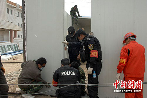 當(dāng)天下午,由成都公安特警30名青年民警組成的突擊隊(duì)與建材集團(tuán)員工一起先用挖土機(jī)將地面推平,然后隊(duì)員們分工合作、用帶來的發(fā)電機(jī)迅速發(fā)電,有的切割泡沫板,有的在鋼板上鉆孔,有的拼接泡沫墻面,在“5.12”抗震救災(zāi)時(shí)掌握的“施工技術(shù)”在這兒全用上了。這時(shí)的天空又一次飄起了雨夾雪,寒氣襲人,但特警隊(duì)員們?nèi)匀桓蓜攀恪S捎诟咴毖,一名?duì)員在劇烈搬送后出現(xiàn)了頭暈癥狀,其他隊(duì)員馬上將他扶到一旁休息,另一名隊(duì)員立即替補(bǔ)上去,他們就這樣輪番著作戰(zhàn)。在拼接板墻的時(shí)候,由于風(fēng)沙很大,隊(duì)員們眼睛、嘴里全是沙,但他們顧不了那么多,心中只有一個(gè)信念:就是以最快速度將板房建好,讓災(zāi)區(qū)的同學(xué)們早日復(fù)課,參加學(xué)習(xí)。