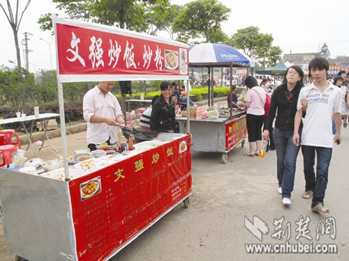 荊楚網(wǎng)消息 (楚天金報(bào)) 記者邵娟 通訊員劉磊報(bào)道:“文強(qiáng)炒飯?文強(qiáng)不是重慶的貪官嗎?老板竟用這種噱頭吸引顧客?”日前,武漢科技大學(xué)校門(mén)前一家名為“文強(qiáng)炒飯”的攤位,雖然吸引了過(guò)往大學(xué)生的眼球,但因被認(rèn)為是店主找的“噱頭”,所以生意并不好。