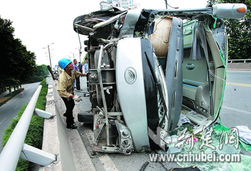 荊楚網(wǎng)消息 (楚天都市報) (記者許洋)昨日11時55分,一輛滿載35名大學(xué)師生的大客車行至青山建設(shè)五路立交橋時,與一輛同向行駛的轎車發(fā)生碰撞,客車側(cè)翻在立交橋橋面上,約有6名學(xué)生出現(xiàn)腦外傷、骨折。