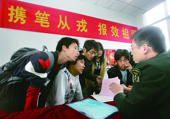 據(jù)徐主任介紹,今冬征兵工作與往年相比,有三個新特點:一是根據(jù)科技強軍的需要,首次大量征集高校應屆畢業(yè)生入伍;二是首次實行面向社會普遍報名征集女兵;三是突出強化征兵廉政建設。據(jù)不完全統(tǒng)計,全省報名應征的適齡青年已達20多萬人。