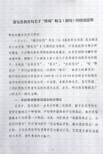 蓬安縣教育局今日在其官方網站刊發(fā)《蓬安縣教育局關于“排場”帖文(新聞)的情況說明》。