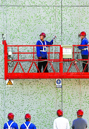 這 93名考生分別由11家保潔公司推薦,都有高層建筑保潔工作經(jīng)驗(yàn),考試之前全部經(jīng)過(guò)100學(xué)時(shí)的培訓(xùn)。43歲的付正會(huì)從事高層建筑保潔工作有十幾年了,鳥巢、水立方的“洗臉”工程都參與過(guò)!跋聒B巢這樣的大項(xiàng)目,要50多人干上半個(gè)月呢。”付正會(huì)說(shuō),這工作收入不低,但有些危險(xiǎn),干活兒的工人都應(yīng)該經(jīng)過(guò)專業(yè)培訓(xùn)和考試。
