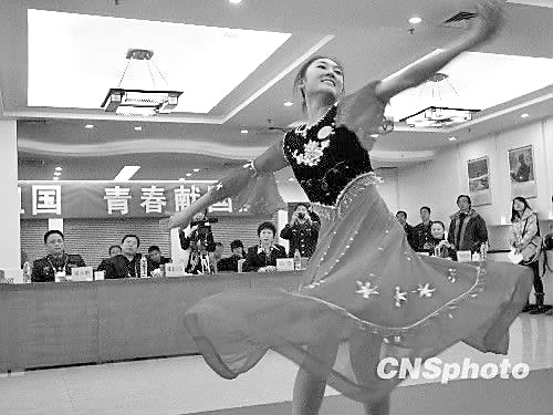8時10分,面試開始,第一個上場的陳曉琴做了簡單的自我介紹,大屏幕顯示她抽中的問題是:如何能做一個合格的軍人。陳曉琴說,要做一名合格的軍人不但要嚴明紀律、聽從指揮,還要團結同志。接著她表演了跆拳道,并拿下了北京市女兵面試的第一個分數(shù)——26分,全部考試,陳曉琴用了8分鐘。 8時50分,來自民族大學舞蹈學院的5號應試者朱瑜上場了;卮鹆讼嚓P的問題后,她拿出了一把藍色的綢扇,跳起了一套她自編的舞蹈,婀娜的舞姿征服了全場的觀眾,也征服了9位評委,她得了28.57的高分,這個分數(shù)也是海淀考區(qū)全天考試的最高分。與她同樣得了最高分的還有清華大學的王曉麗。