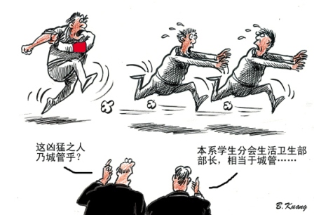 區(qū)區(qū)一件衛(wèi)生檢查的小事,何以弄成一樁血案?學(xué)生干部及學(xué)生之間的溝通對(duì)話能力為何如此之弱以至于拔刀相向,值得家長(zhǎng)及教育人士思考。而學(xué)生會(huì)干部的“過度執(zhí)法”,是否也折射了學(xué)生會(huì)這個(gè)“準(zhǔn)官場(chǎng)”的惡習(xí)呢? 文/丫丫