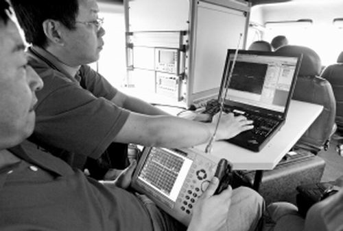 據(jù)了解,信息探測車里除了筆記本電腦顯示信號外,還有一臺專門監(jiān)測儀器!靶盘杺魉瓦M來后,無線電監(jiān)測儀就會發(fā)出信號,一旦發(fā)現(xiàn)可疑信號,會立即追蹤信號源,然后將其屏蔽。屏蔽的都是‘點’,附近的通訊不會受影響!惫ぷ魅藛T稱,昨天上午共截斷了兩條信號。由于監(jiān)測到的時間較短,所以該儀器只能屏蔽信號源,考生的位置無法鎖定。截至記者發(fā)稿時,公安機關已通過市信產(chǎn)局監(jiān)控的信號,抓獲了兩名傳送可疑信號的嫌疑人,并將其拘留作進一步調(diào)查。