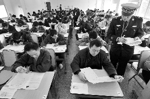 昨日早上剛到8:00,不少心急的考生已經(jīng)來(lái)到位于廣州城市職業(yè)學(xué)院廣園校區(qū)的交通協(xié)管員筆試考場(chǎng)!澳挲g小、學(xué)歷高的并不占絕對(duì)優(yōu)勢(shì)。”交警支隊(duì)政治處副主任、昨日的副主考官?gòu)埾鏉嬖V記者,報(bào)名者中不乏一些大專、本科學(xué)歷的人士,還有一個(gè)碩士研究生,但無(wú)奈視力不好體檢關(guān)過(guò)不了,無(wú)緣筆試。