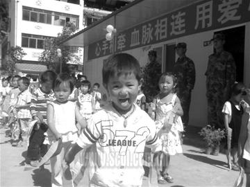 “好漂亮的鋼琴!媽媽,這下我可以學(xué)唱歌跳舞啦!”昨日上午,彭州市龍門山鎮(zhèn)上傳出孩子們興奮的叫聲,一雙雙小手在嶄新的板房內(nèi)四處摸索。這是5·12地震后,四川災(zāi)區(qū)建起的第一個“五星級”板房幼兒園。廣州空軍平日里修建機場、跑道的工程師們,連續(xù)奮戰(zhàn)7個晝夜,在廢墟旁為150名孩子重新建起了樂園。
