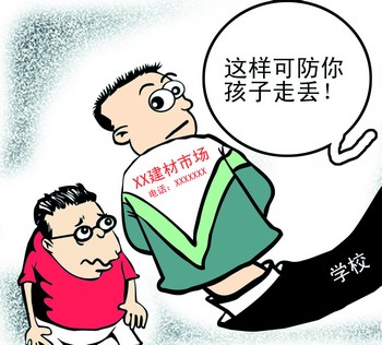 近日,杭州下沙金沙學(xué)校學(xué)生穿上了新校服,校服是家長(zhǎng)掏錢(qián)買(mǎi)的,校服背后寫(xiě)著大大的“杭州恒大建材市場(chǎng)”幾個(gè)字,還留了電話號(hào)碼。校長(zhǎng)解釋稱(chēng),之所以印這個(gè),一是為了防學(xué)生走丟,二是為了感謝建材市場(chǎng)對(duì)學(xué)校工作的支持,電話號(hào)碼是校長(zhǎng)辦公室的。(10月29日《都市快報(bào)》)