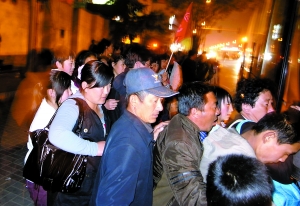 昨晚7時許,解放軍307醫(yī)院門口,數(shù)十名家長和孩子相互配對,排成四列,正在等候大巴車。