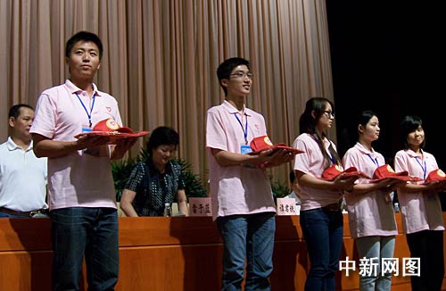 在2008年服務(wù)西部的志愿者代表發(fā)言后,全場(chǎng)志愿者進(jìn)行了宣誓。隨后,雷于藍(lán)為即將開(kāi)赴廣西、四川汶川、甘肅隴南和貴州四省區(qū)的四支服務(wù)隊(duì)授旗。