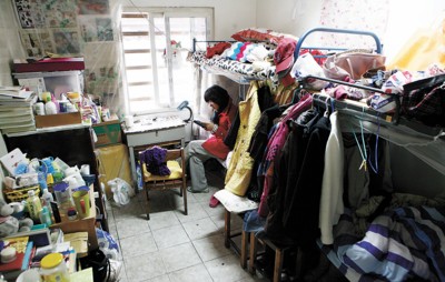 每間不大的房間里都住了五六個人,每個人只有一張小書桌。洗漱用品、餐具、書籍等東西都雜亂的堆放在上面。衣物都整理好放在箱子里,被塞到了床底下。房子里唯一的私人空間就是自己的小床,用布簾圍得嚴嚴實實。很多人都在床上擺了一張小書桌,堆了很多求職信息和個人簡歷,他們準備找份理想的工作,來改變自己在這個城市中的命運。