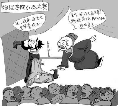 盡管女生們紛紛對男生這種“吃不著葡萄說葡萄酸”的行為表示強烈鄙視,但由于男生在數(shù)量上占絕對優(yōu)勢,所以《赤壁之戰(zhàn)》拿到系里演出那天,“笑果”極好,用胡亮鈞的話說,“一百多匹狼,笑起來差點兒把教室屋頂掀了!”而那天負責拍攝視頻的同學,由于笑得直不起身,最后拍出來的視頻也東歪西扭的……