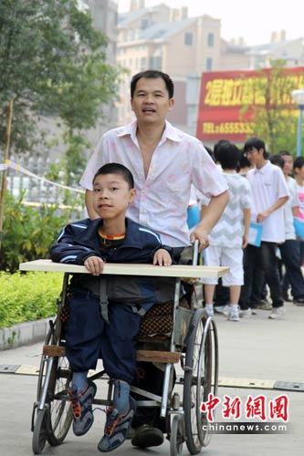 中新網宜昌6月20日電(記者 劉良偉 上官純青)20日,湖北宜昌7.7萬名學子參加了當地的中考,這其中有一位特殊的孩子——宜昌市十五中905班的王宇,在父親的陪伴下,來到當地專門設立的特殊考生考場參加了考試。十多年來,父親王忠(化名)為患有罕見的肌肉營養(yǎng)不良癥的王宇,和妻子沒有放棄,用人間真愛一路陪伴著兒子,無論風吹雨淋,他都執(zhí)著地背孩子上學,并自己鉆研醫(yī)學,以身試藥,用真心真愛演繹著平凡人生里不朽的傳奇。