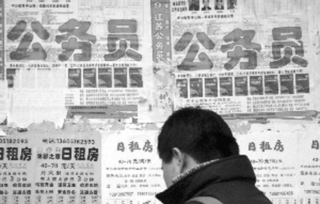 昨天,記者從南京幾所高校校內(nèi)信息公告欄里看到,公務(wù)員考試輔導(dǎo)班大有風(fēng)頭蓋過考研輔導(dǎo)班的趨勢,連學(xué)生宿舍樓門口、餐廳門口公告欄上,也張貼著公務(wù)員考試輔導(dǎo)的招生海報(bào)。