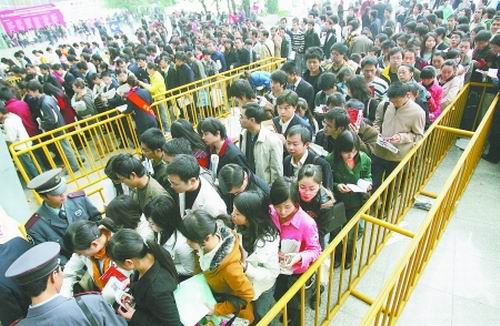 經(jīng)兩天“海選”,由成都市人事局主辦、成都人才市場(chǎng)承辦的2008成都冬季特大型人才招聘會(huì)暨高校畢業(yè)生供需洽談會(huì),昨日(11月16日)在世紀(jì)城新會(huì)展中心正式落幕。作為今冬規(guī)模最大的一次特大型招聘會(huì),今年只有324家企業(yè)攜6226個(gè)崗位前來(lái)“選秀”。盡管招聘單位和崗位數(shù)量大幅縮水,但兩天時(shí)間里求職大軍數(shù)量仍逼近7萬(wàn)。