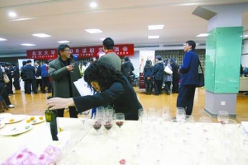 幾名學(xué)生拿著紅酒走到翰威特咨詢公司大中華區(qū)人力資源總監(jiān)朱纓面前,碰杯后,向她咨詢?cè)趺磳懬舐毢?jiǎn)歷。昨晚(12月11日),在北京大學(xué)第一體育館地下室,一場(chǎng)“求職交流酒會(huì)”吸引了8家企業(yè)和200多名同學(xué)參與。