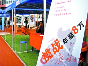 “據(jù)我所知,從沒有人搞這種嘗試,”小莫自信地說(shuō),“擺攤”之前,他曾經(jīng)對(duì)設(shè)計(jì)類學(xué)生的就業(yè)情況做了一番了解,發(fā)現(xiàn)招聘單位以小企業(yè)居多,“首先從工資上,就感到小企業(yè)對(duì)設(shè)計(jì)并不重視,”他說(shuō),很多小企業(yè)都打出1000~2000元每月的工資,所以他執(zhí)意打出“年薪8萬(wàn)”的要求,也是想提起企業(yè)單位對(duì)設(shè)計(jì)的重視。