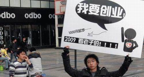 “我要創(chuàng)業(yè),1000元起步……2009,看老子的!”昨(8)日下午4時許,香檳廣場上,一名小伙子擺出一副“!奔軇,舉著自制的告示牌,喊著“自主創(chuàng)業(yè)”的口號,引來了附近路人紛紛駐足觀看。