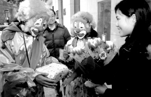 頭戴紅鼻頭鬈發(fā)的小丑面具,身穿一套連體的彩裝寬松衣……昨天下午,當手捧鮮花禮品、這身打扮的袁楓和王洪福從威寧路一乘上地鐵二號線,許多乘客還以為又巧遇“雷人”了。其實他們都是大學生快遞員,正在去送祝福快遞的途中。