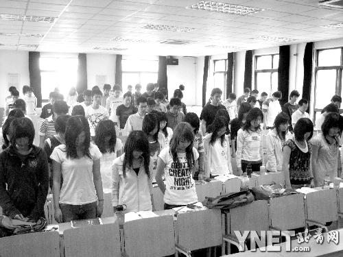 教室里、大禮堂、宿舍樓、辦公室、實驗室……昨天下午14點28分,北京各高校凡是有學(xué)生和老師的場所,都成為師生為四川災(zāi)區(qū)死難同胞默哀的地方。清華大學(xué)昨天開通了所有教室的廣播,廣播連通了中央人民廣播電臺。隨著那一聲尖銳而悠長的鳴響劃破天空,清華第一教學(xué)樓101教室正在上課的100多名同學(xué)站起來,共同為災(zāi)區(qū)死難者默哀,主講老師黃成英教授打開了他特意準(zhǔn)備的PPT頁面。