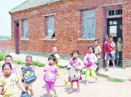“學(xué)校只有一棟兩層只能容納8個(gè)班的教學(xué)樓,學(xué)前班和一至六年級(jí)占去7個(gè)教室,多媒體遠(yuǎn)程教 室和辦公室合占一個(gè)教室。幼兒班的34個(gè)孩子沒(méi)處上課,晴天就在 3間破瓦房里湊合,雨天就停課!标惡S窭蠋熣f(shuō)。幼兒班上課的3間破瓦房,房頂明顯下陷,破舊的教室門(mén)上橫七豎八地釘著幾個(gè)木板擋住窟窿,窗戶(hù)上已經(jīng)沒(méi)有玻璃,墻體上多處有明顯裂縫!昂⒆釉诶锩嫔险n太嚇人了!痹谠撔iT(mén)口,前來(lái)接孫子的73歲老人李繼剛說(shuō),“房子是上世紀(jì)70年代末蓋的,娃子在里面上課,家長(zhǎng)天天擔(dān)心!