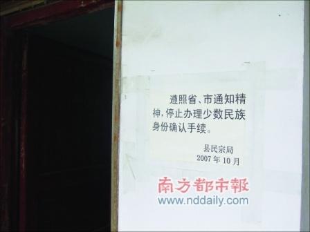 在民宗局辦公室的門口處,張貼著落款為“2007年10月”的一份告示,“遵照省、市通知精神,停止辦理少數(shù)民族身份確認(rèn)手續(xù)!迸砹f,這是因?yàn)檎宜齻冝k民族變更手續(xù)的人很多,“很煩,就在門口貼了這張公告。”