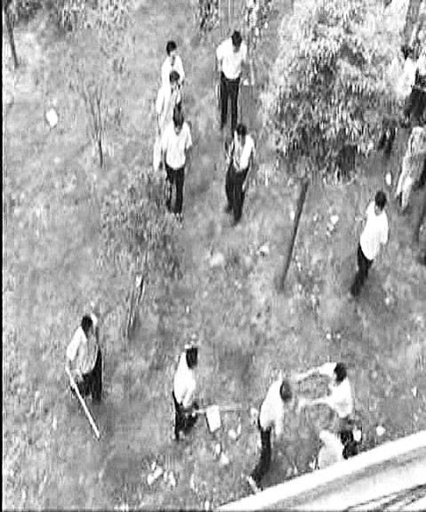 記者在光碟中看到,在文都教學樓下的草坪上,幾名穿保安制服的男子手持鐵棒,毆打一名男子,幾人上前勸架,也被對方棒擊。雙方相互拉扯,后來人越來越多,拳打腳踢的場面隨處可見。整個過程有20多分鐘。