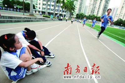 據(jù)氣象部門預(yù)報(bào),深圳昨天晴間多云,東北風(fēng)2級(jí),氣溫24—31℃。下午5時(shí),實(shí)驗(yàn)學(xué)校初中部的250米環(huán)形跑道上,初一(十)班的同學(xué)們正氣喘吁吁地跑步,隊(duì)伍有些稀稀拉拉。幾圈下來(lái),不少學(xué)生的后背已經(jīng)濕透。一些剛跑完的學(xué)生已累得說(shuō)不出話來(lái),有些干脆一屁股坐在了地上。
