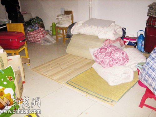 據(jù)張同學介紹,她們宿舍還有三分之一的同學因種種原因沒能搬,晚上將留在宿舍打地鋪過夜。她們的室友有的回家了,有的去網(wǎng)吧包夜。昨晚9時30分,記者獲悉,該院部分學生已經打好地鋪,準備擠在一起過夜。