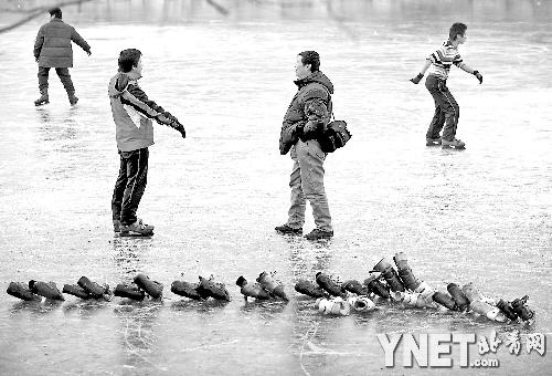 從商販處租一雙冰鞋10元錢,無(wú)需定金,沒有使用時(shí)間限制。一位坐在石椅上換冰鞋的女學(xué)生說(shuō),因?yàn)樽庑瑑r(jià)錢便宜,所以和室友一起來(lái)滑冰,覺得“應(yīng)該不會(huì)出什么安全問題”。