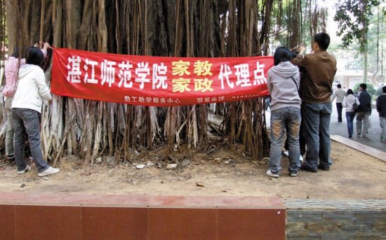 據(jù)了解,湛江師范學(xué)院勤工助學(xué)服務(wù)中心設(shè)有家政部和熱線電話,從周一至周日每天上午到下午,都有學(xué)生干部義務(wù)接聽電話,為雇主提供服務(wù)。而校外也有企業(yè)打出“大學(xué)生家政服務(wù)”牌子招攬業(yè)務(wù)。不過,學(xué)校與企業(yè)的目的不同,前者是為了幫助困難大學(xué)生渡過難關(guān),而后者則是以贏利為目的。