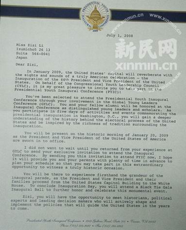 新民網(wǎng)29日致電該女生所在的成都市實(shí)驗(yàn)外國(guó)語(yǔ)學(xué)校,分管德育工作的副校長(zhǎng)李俊說(shuō),該校高一女生李紫子獲邀參加奧巴馬就職典禮確有其事,但發(fā)出邀請(qǐng)函的單位并不是美國(guó)國(guó)會(huì),而是國(guó)會(huì)下屬的一個(gè)名為“全球青少年領(lǐng)袖論壇”(the Congressional Youth Leadership Council)的青少年組織。去年8月,李紫子因參加了該組織舉辦的比賽并表現(xiàn)出色,因此才會(huì)收到邀請(qǐng)函。
