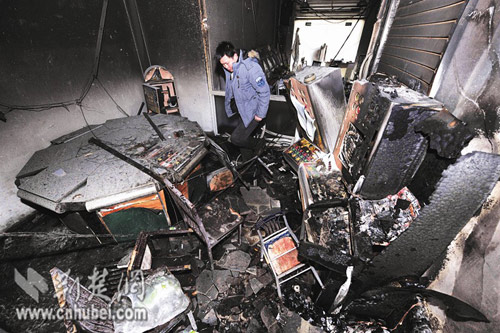 該學生公寓位于武漢經(jīng)濟技術(shù)開發(fā)區(qū)碧湖新村。昨日上午9時,記者在該公寓42棟宿舍看到,該棟宿舍共有6層,其中1樓為臨街門面。失火的游戲機室位于3單元201宿舍樓下,面積約50平方米,里面有10多臺游戲機,均被燒毀(如圖)。