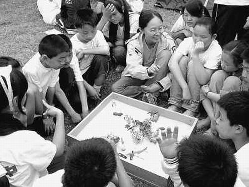 申荷永正在組織北川中學(xué)的學(xué)生玩一個(gè)名叫“沙灘游戲”的活動。這個(gè)將心理治療手段隱藏在游戲之中的沙盤深受孩子們喜愛。