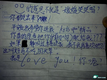 紙條內(nèi)容除了當(dāng)事雙方如此鄭重的表白外,還記錄了一段男生向女生索要初吻的文字,男生希望女生在一個(gè)特定的時(shí)間把“kiss(吻)”送上,他還特別附加問一句“你真的愿意把你的(初吻)獻(xiàn)給我嗎?”
