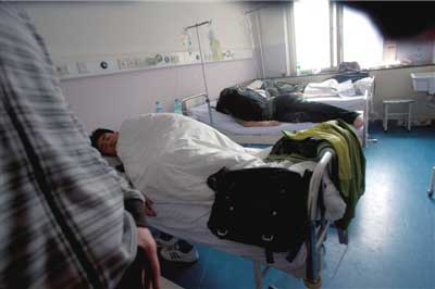 昨天下午1點(diǎn),在北京市第六醫(yī)院南樓住院部4層,中央戲劇學(xué)院的患者分散在3個(gè)病房,有近20人。他們打著點(diǎn)滴,躺在病床上,有同學(xué)看護(hù),學(xué)校老師也不斷查看。醫(yī)院西樓還有部分中戲患者,3人在重癥監(jiān)護(hù)室。一患病男生說,他事發(fā)前一天曾吃過學(xué)校食堂的三明治。另據(jù)前來探病的女同學(xué)說:“幾乎吃了三明治的同學(xué)都被送到了醫(yī)院診治。”
