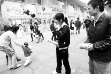 40分鐘后,9名學(xué)生來到觀音橋。10時(shí)許,張玉琴鼓足勇氣走向一家婚紗店,老板給了她一疊宣傳冊(cè),“不管用何種方法,只要是能找夠15名顧客來店咨詢,就可得到30元錢!边@是這個(gè)團(tuán)隊(duì)第一個(gè)找到“工作”的人。