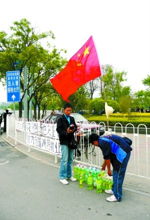昨日下午,九棵樹(shù)地鐵站口北側(cè)的十字路口,陳進(jìn)和同伴俞洪帶著他們的可樂(lè)飲料,在人行道柵欄上又掛起他們的橫幅標(biāo)語(yǔ),這次,他們插上了一面鮮紅的國(guó)旗,在風(fēng)中招展。