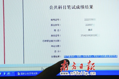 吉林某大學研一女生王藝的遭遇更具有黑色幽默。她說,報考去年的國家公務員考試她都沒有好好準備“有一半題都是蒙的,感覺A好就選A”。1月9日通過網(wǎng)上查分,“公共科目筆試成績結果”的網(wǎng)頁打開時她幾乎崩潰:“ 行政職業(yè)能力測試分數(shù)”得分為0,“處理結果:有嚴重違紀,違規(guī),如有異議,可在7日內提出復核申請”。王藝哭笑不得。