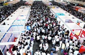 據(jù)介紹,此次共吸引了600多家用人單位參展,提供了5000余個(gè)職位,主要涉及工程技術(shù)、電子、銷售、人力資源以及制造業(yè)等。其中,不乏中國(guó)人壽、百盛、北大青鳥(niǎo)、聯(lián)想、百度、大中等知名企業(yè)。在舉行招聘會(huì)的國(guó)展2、3、4號(hào)館里,應(yīng)聘者人頭攢動(dòng),水泄不通,主辦方為了保證三個(gè)展館內(nèi)的正常運(yùn)行還進(jìn)行了暫時(shí)的人流控制和疏導(dǎo)。截至昨天11時(shí),招聘會(huì)已吸引了近2萬(wàn)名求職者。
